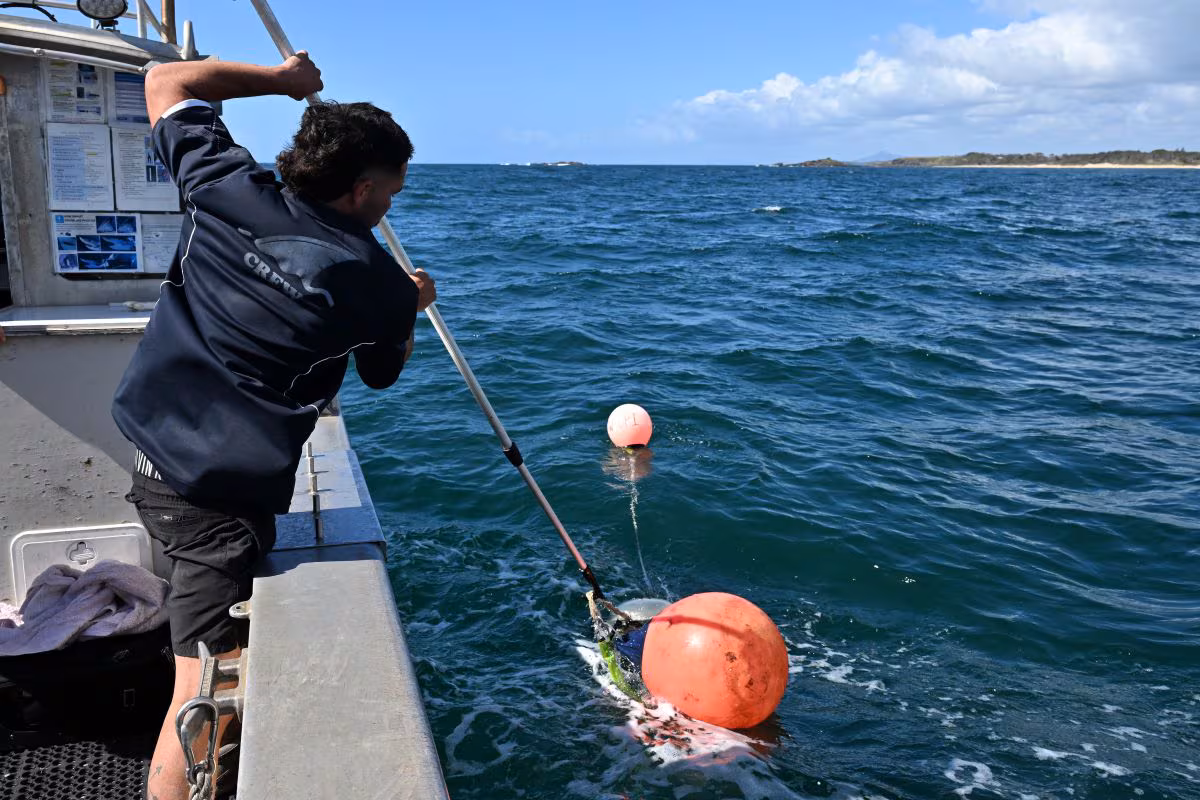 Cada día, los trabajadores colocan 305 boyas conectadas por satélite en las aguas más concurridas, con una profundidad de hasta 15 metros, en la costa de Nueva Gales del Sur como parte del programa estatal.