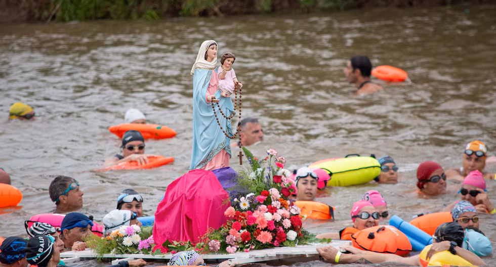 Cerca de 500 personas acompañaron a nado, en las aguas del arroyo Yaguarón (un curso de agua que delimita las provincias de Santa Fe y Buenos Aires), a la imagen de la Virgen María, mientras devotos nadadores se turnaron para llevar por trechos a las andas de la madre de Cristo.