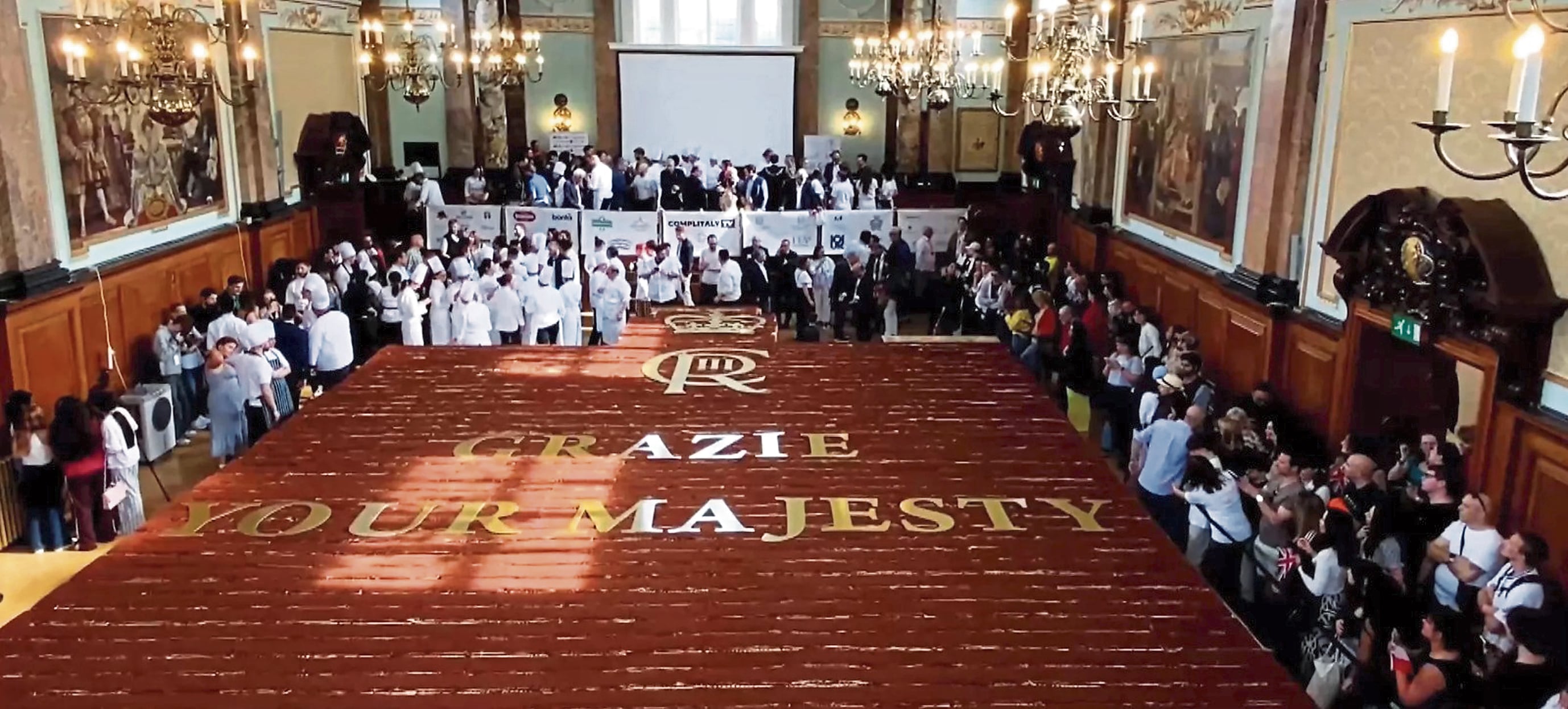 La receta ganadora contiene más de 50,000 bizcochos de soletilla, más de 3000 huevos, además del café, mascarpone, azúcar y cacao correspondientes, para ser marco al agradecimiento personalizado al rey Carlos III y la reina Camila, “Grazie your majesty” (Gracias sus majestades), en letras doradas, por hacer del Reino Unido su nuevo hogar.