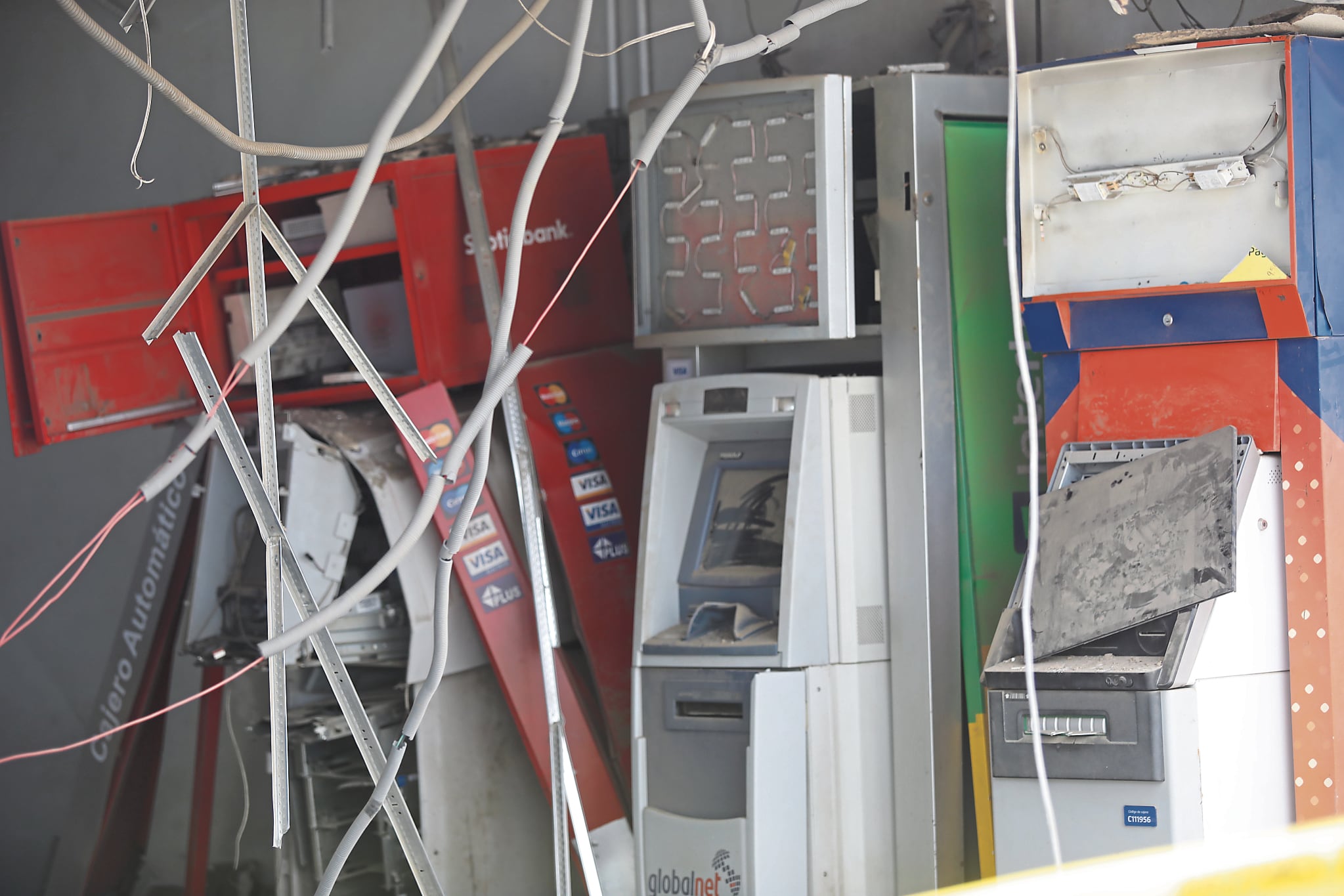 El cajero, destrozado por completo, pertenecía al Scotiabank. Los otros cajeros sufrieron daños superficiales.